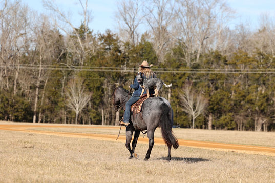 Indigo not only shines in the arena; he's a reliable partner on the trail and is an experienced ranch horse! On the trails, he's steady, honest, and sure-footed. No matter the terrain, he'll confidently venture anywhere you ask. Whether riding alone, leading a group, or quietly following, he remains calm and composed. We've spent plenty of time desensitizing him to a variety of challenges—nothing phases him. He's excellent with traffic, machinery, bullwhips, wildlife, bicycles, and crossing water. Whether carrying the flag or riding bareback, Indigo handles it all like a champ. He's even great with dogs, allowing them to ride along and jump around him without a care in the world. His easygoing nature ensures he remains steady through loud noises and unexpected situations.