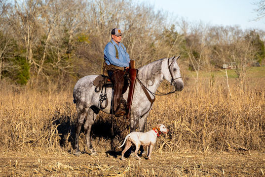 Cash has extensive experience bird hunting and is excellent with gunfire and wildlife. You can saddle him up on the coldest of mornings and be ready to go work dogs. He is great with crazy bird dogs all under his feet and jumping on him. He will ground tie while you flush birds and shoot, then stand like a gentleman while you put your gun back in the scabbard. He knows the job well and is always up for the task.